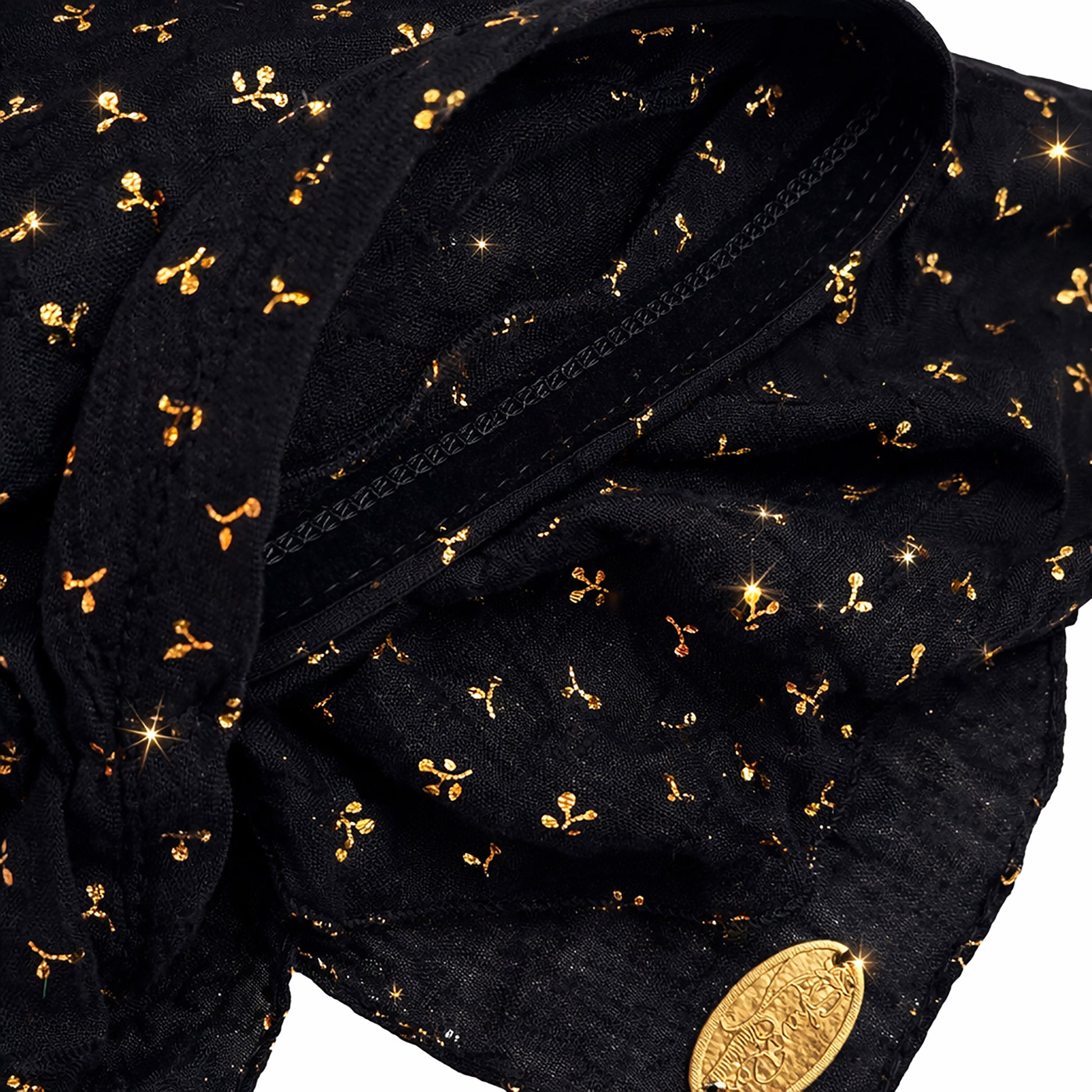 - BLACK PRE-TIED HEADSCARF; NON SLIP SOFT COTTON METALLIC GOLD FLORAL: Soft cotton headscarf is super comfy and long lasting with our flexible double stitch hems and decorative over-lock finish!