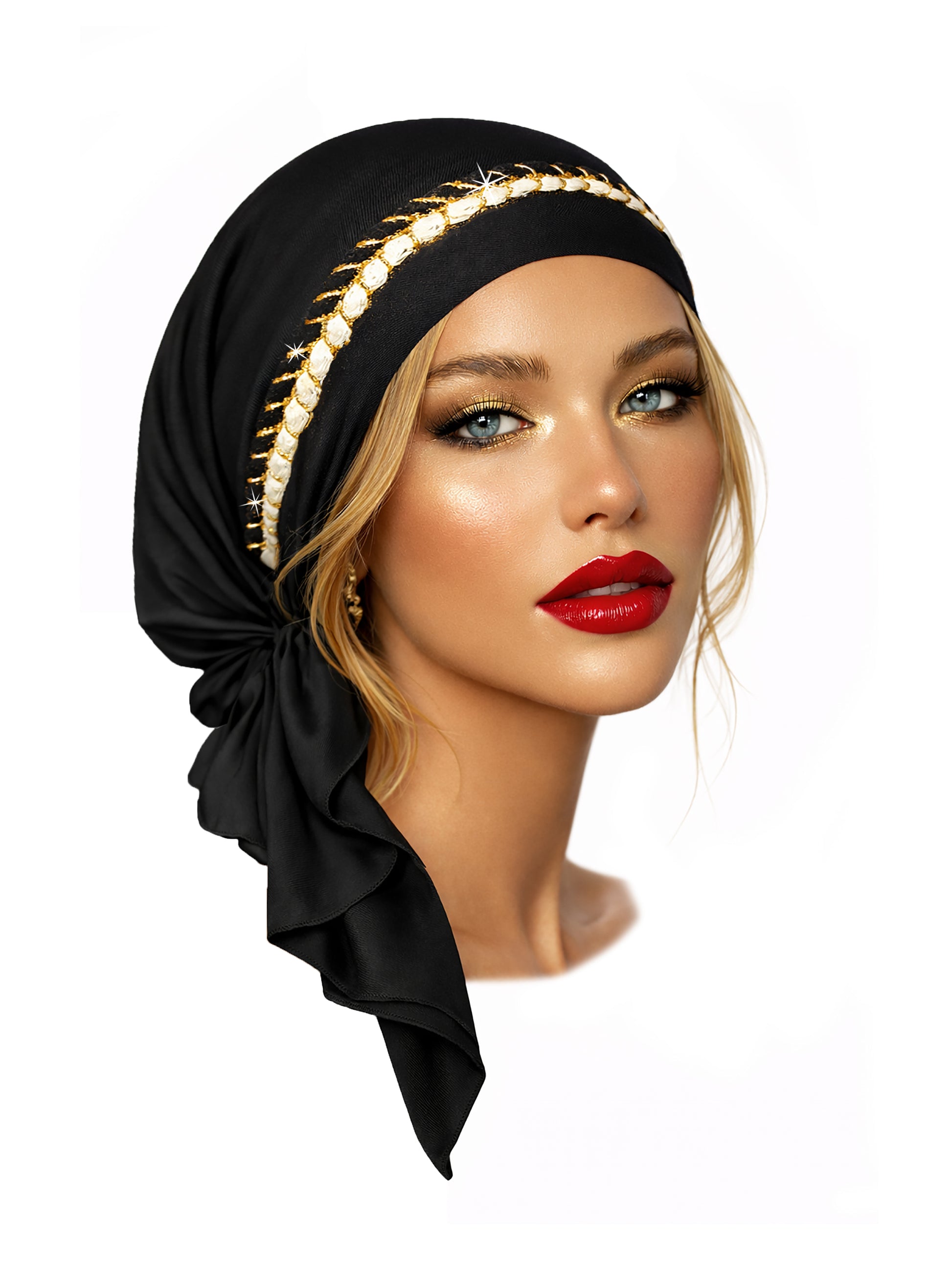 - BLACK NON SLIP COTTON PRE-TIED HEADSCARF; BLACK GOLD TRIM: Soft cotton headscarf is super comfy and long lasting with our flexible double stitch hems and decorative over-lock finish! Beautiful lace detail adds the perfect touch to this gorgeous headscarf!